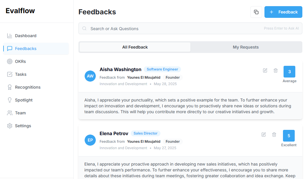 EvalFlow combines Instant feedback, smart goals, real-time insights, and automated reviews.